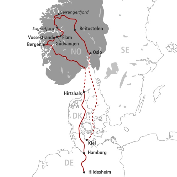 Weiterreise über die deutsch-dänische Grenze und durch die flachen Landschaften Jütlands nach Hirtshals. Hier erwartet uns am Abend die Fährüberfahrt nach Norwegen mit einer der Kreuzfahrt-Fähren der Fjord Line. Die Schiffe verfügen über diverse Restaurants, Cafés, Bars sowie ein Casino. In der Seaview-Bar wird am Abend ein abwechslungsreiches Unterhaltungsprogramm geboten.